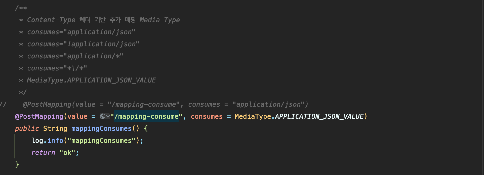# 미디어 타입 조건 매핑 - HTTP 요청 Content-Type, consume