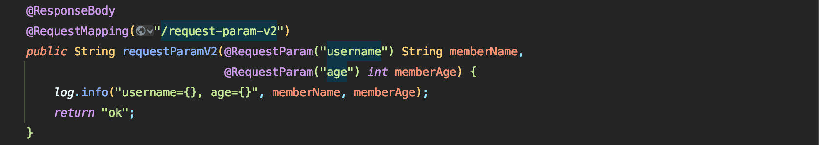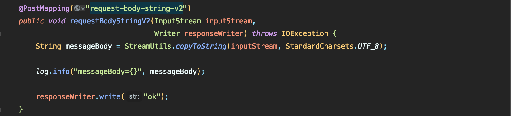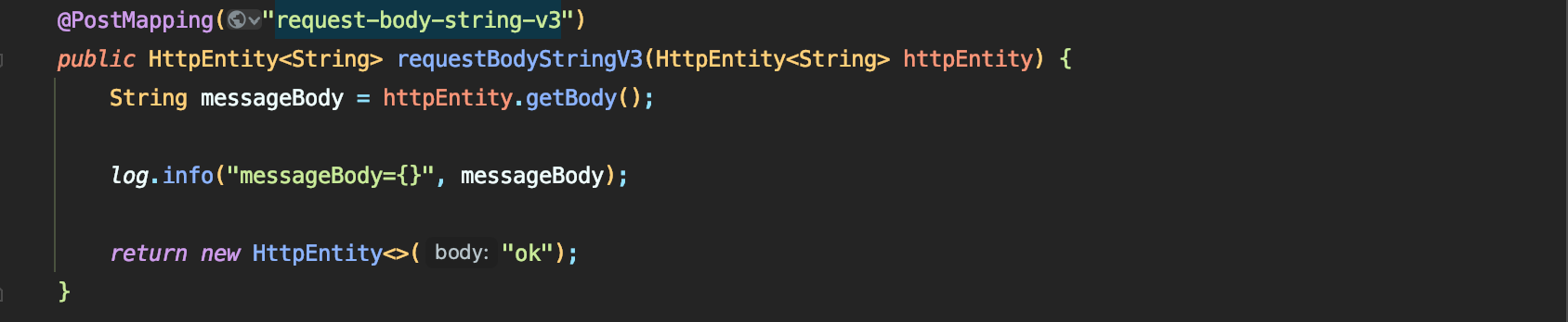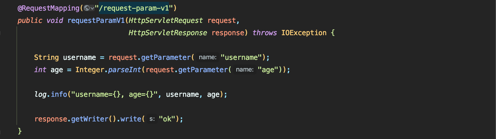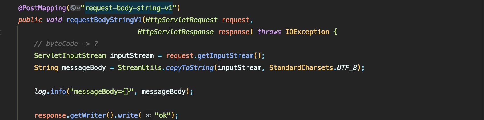 - (서블릿을 직접 다룰때처럼) HttpServletResponse 객체를 통해서 HTTP 메시지 바디에 직접 "ok" 응답 메시지 전달