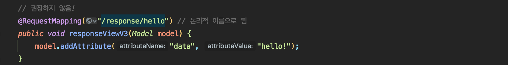 - @Controller를 사용하고, HttpServletResponse, OutputStream(writer) 같은 HTTP 메시지 바디를 처리하는 파라미터가 없으면, 요청 URL을 참고해서 논리 뷰 이름으로 사용