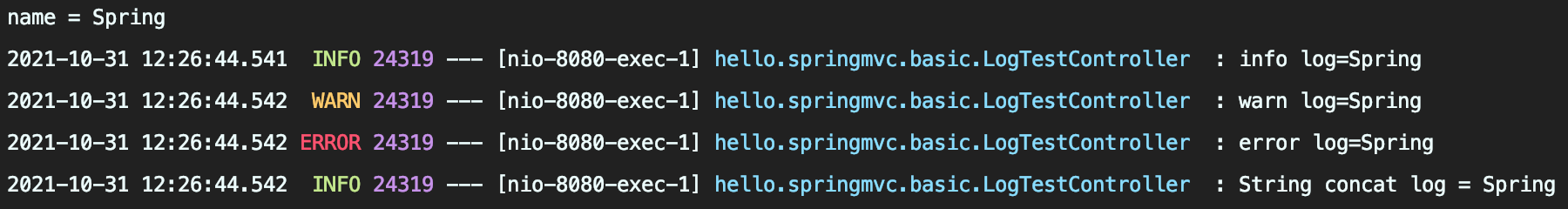 - 패키지와 그 하위 로그 레벨 설정 가능 : logging.level.hello.springmvc=debug