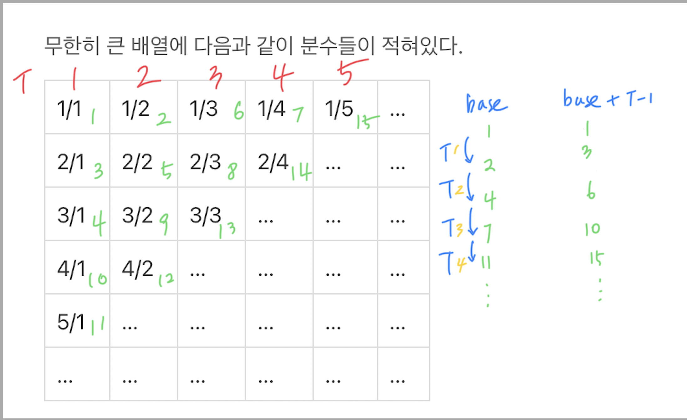 짝수는 base를 기준으로 홀수는 base+T-1을 기준으로 해당번호를 찾아서 분모, 분자를 찾았다.