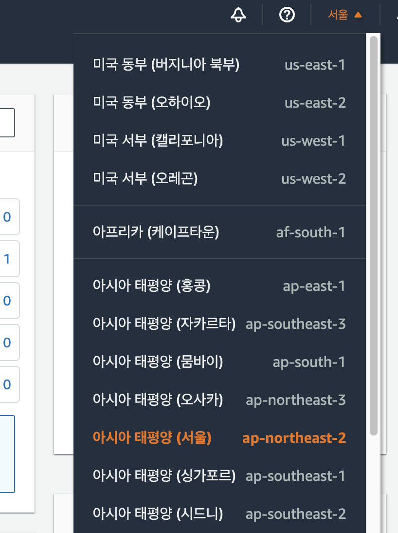4. Region 설정 - 아시아 태평양 (서울) - 무료로 사용하기 위해 중요!
