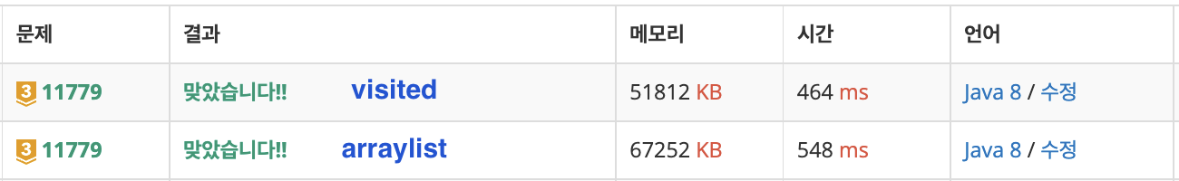 1234567891011121314151617181920212223242526272829303132333435363738394041424344454647484950515253545556575859606162636465666768697071727374757677787980818283848586878889import java.io.BufferedReader;import java.io.IOException;import java.io.InputStreamReader;import java.util.*;public class Main11779_BufferedReader {static class Route implements Comparable<Route>{int num;int cost;List<Integer> bus = new ArrayList<>();public Route(int num, int cost, List<Integer> bus) {this.num = num;this.cost = cost;this.bus = bus;}@Overridepublic int compareTo(Route o) {return this.cost - o.cost;}}public static int N, M;public static List<List<Route>> list;public static List<Integer> answer;public static PriorityQueue<Route> pq;public static int[] dist;public static void solve(int start, int end) {pq = new PriorityQueue<>();pq.add(new Route(start, 0, answer));dist[start] = 0;boolean[] vtd = new boolean[N+1];while(!pq.isEmpty()) {Route r = pq.poll();if(vtd[r.num]) continue;vtd[r.num] = true;for(Route ro: list.get(r.num)) {if(dist[ro.num] > dist[r.num] + ro.cost) {dist[ro.num] = dist[r.num] + ro.cost;List<Integer> tmp = new ArrayList<>(r.bus);tmp.add(ro.num);if(ro.num == end) {answer = tmp;}pq.add(new Route(ro.num, dist[ro.num], tmp));}}}}public static void main(String[] args) throws IOException {BufferedReader bf = new BufferedReader(new InputStreamReader(System.in));StringTokenizer st = new StringTokenizer(bf.readLine());N = Integer.parseInt(st.nextToken());st = new StringTokenizer(bf.readLine());M = Integer.parseInt(st.nextToken());list = new ArrayList<>();dist = new int[N+1];for(int i = 0; i <= N; i++) {list.add(new ArrayList<>());dist[i] = 987654321;}for(int i = 0; i < M; i++) {st = new StringTokenizer(bf.readLine());int a = Integer.parseInt(st.nextToken());int b = Integer.parseInt(st.nextToken());int c = Integer.parseInt(st.nextToken());list.get(a).add(new Route(b, c, new ArrayList<>()));}st = new StringTokenizer(bf.readLine());int start = Integer.parseInt(st.nextToken());int end = Integer.parseInt(st.nextToken());answer = new ArrayList<>();answer.add(start);solve(start, end);System.out.println(dist[end]);System.out.println(answer.size());StringBuilder sb = new StringBuilder();for(int i = 0; i < answer.size(); i++) sb.append(answer.get(i)).append(" ");System.out.println(sb.toString());}}cs 2) Visited 경로