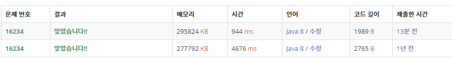 작년 8월에도 풀었었던 문제이다. 오늘 푼 방식이 완벽하게 효율적이라고는 말하지 못하겠지만, 적어도 작년에 왜 저렇게 풀었던 방식이 비효율적이라는 것은 알았다. 굳이 필요하지 않은 부분을 넣어서 시간이 몇 배는 많이 들게 하는 코드였다. 다시 풀어보길 잘했다라는 생각이 든다.