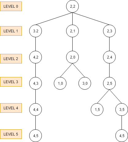주어진 값인 (2,2) 부터 level 5까지 갈 수 있는 모든 노드의 갯수를 세서 return하면 된다. 마지막 4.5는 중복되나 visited한 노드를 check하는 array가 있으니깐 신경 안 써도 된다!